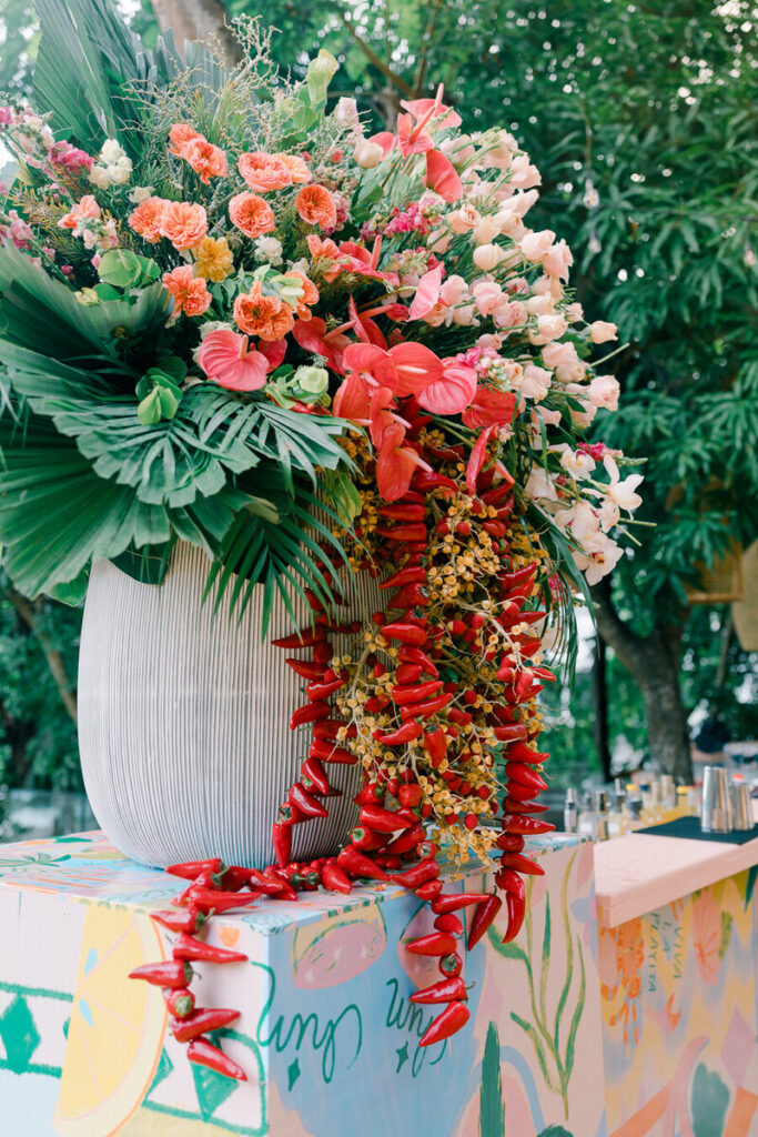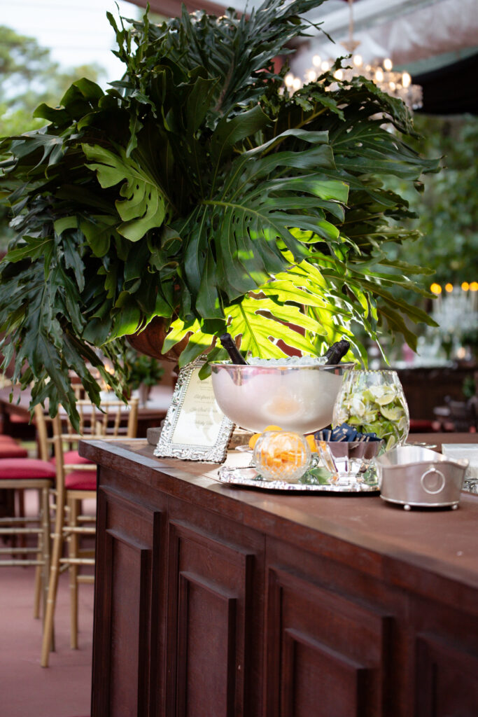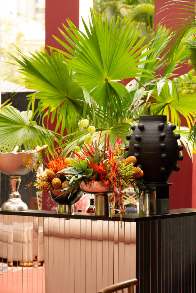 - Decoración floral y botánica: orgánica, fresca, no obstaculiza al bartender pero sí embellece el espacio.